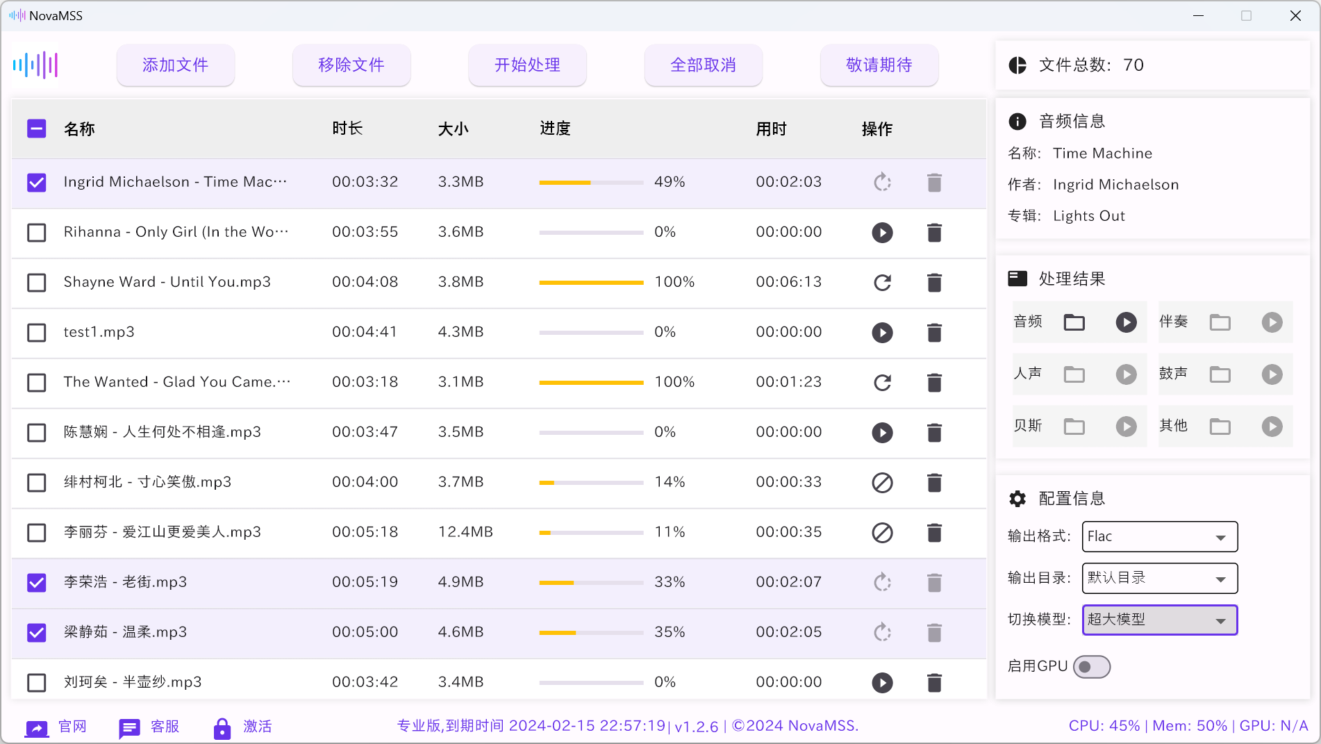 wav,flac,mp3等格式 - 内置音频播放器,分离结果可直接播放